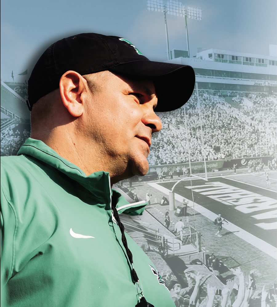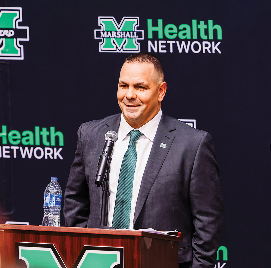 The first few months of Gibson’s first college head coaching job may have been even more intense than most. He inherited a team that won the Sun Belt Conference championship, but 19 of those players followed former Head Coach Charles Huff to the University of Southern Mississippi at the end of the season. Eventually more than 30 players entered the transfer portal, leaving Gibson with the monumental task of recruiting 60 new players to rebuild the Marshall roster.